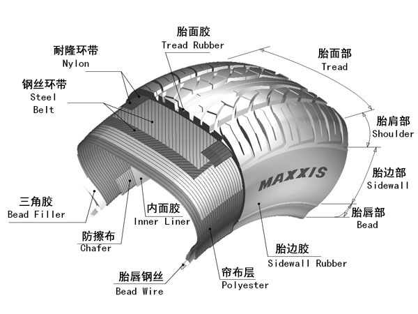 - 這是輪胎的主要骨架,是用來(lái)承受輪胎的荷重壓力、內(nèi)部的空氣壓力及橫向的剪切力等,其主要是由多層的簾布(人造纖維+膠料)或鋼絲組合而成。