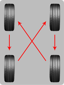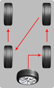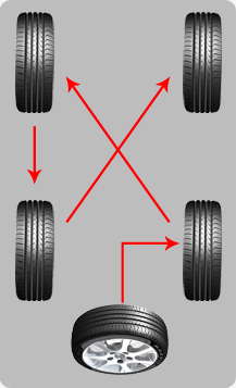如果輪胎的磨損情況嚴(yán)重,建議使用如圖的方式交換前后輪胎,這樣可以使得所有輪胎保持大致相同的損耗。